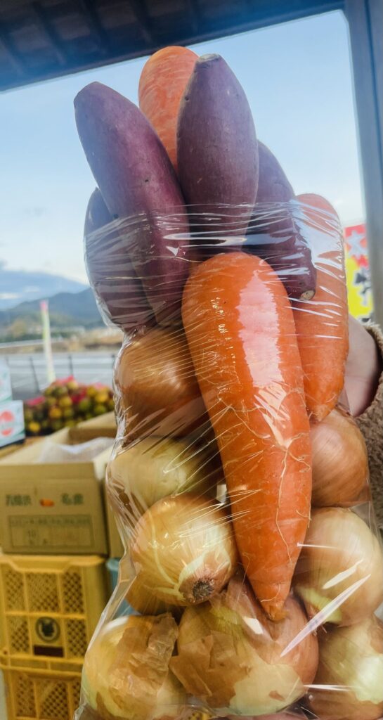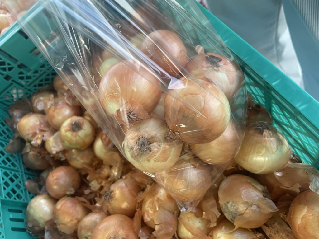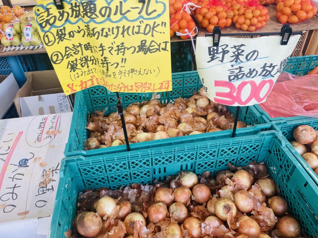 更に出入り口付では”野菜の詰め放題“も行われていて、この日はタマネギ・ニンジン・サツマイモの3種類が用意されていました。