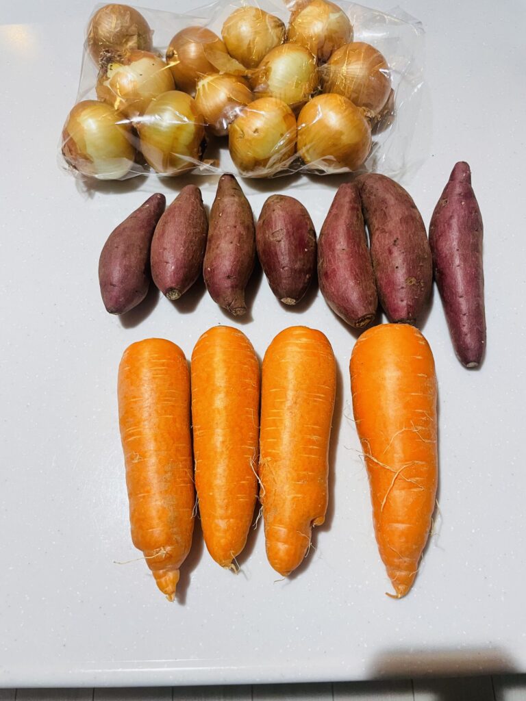 タマネギ12個・サツマイモ7個・ニンジン4本。